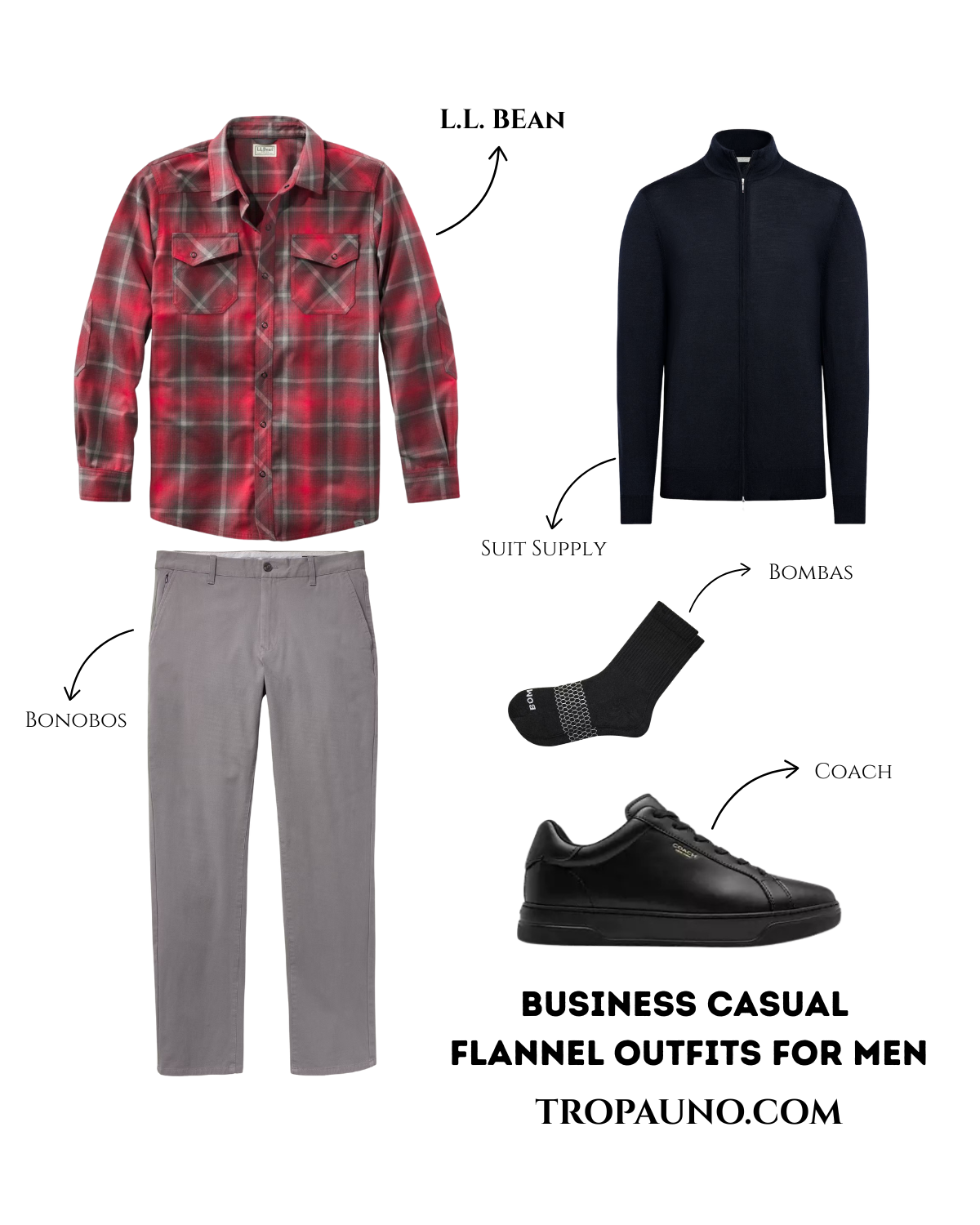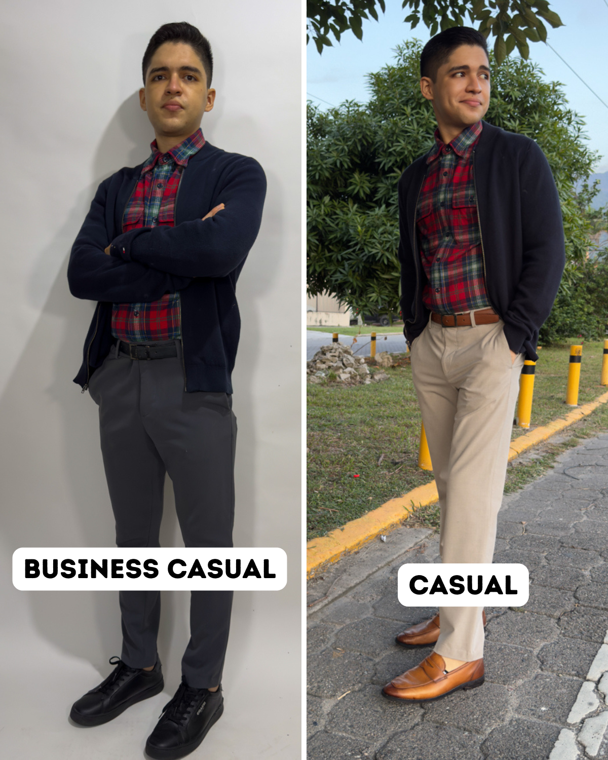 This is the outfit from the comparison picture above. Gray pants are probably the best way of helping an outfit become business casual. They are a menswear staple that go with almost everything. I’m pairing them with a minimal pair of black leather sneakers and a cardigan. If you wear a flannel like this one make sure to add a layer like a cardigan. Avoid a formal blazer.